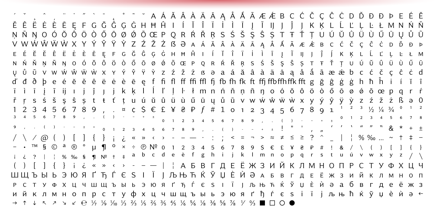 The font family contains 8 weights from Thin to Extra Bold, with matching true italics. It supports extensive language support including Cyrillic, as well as numerous OpenType features such as small caps, ligatures, several sets of figures, case-sensitive punctuation, ordinals.