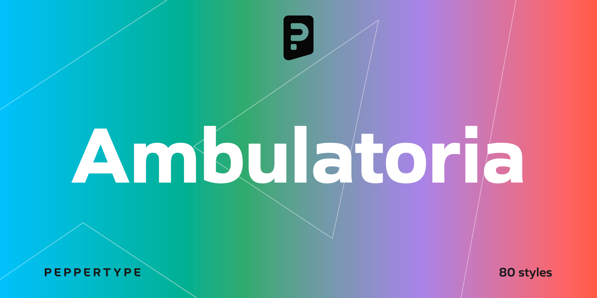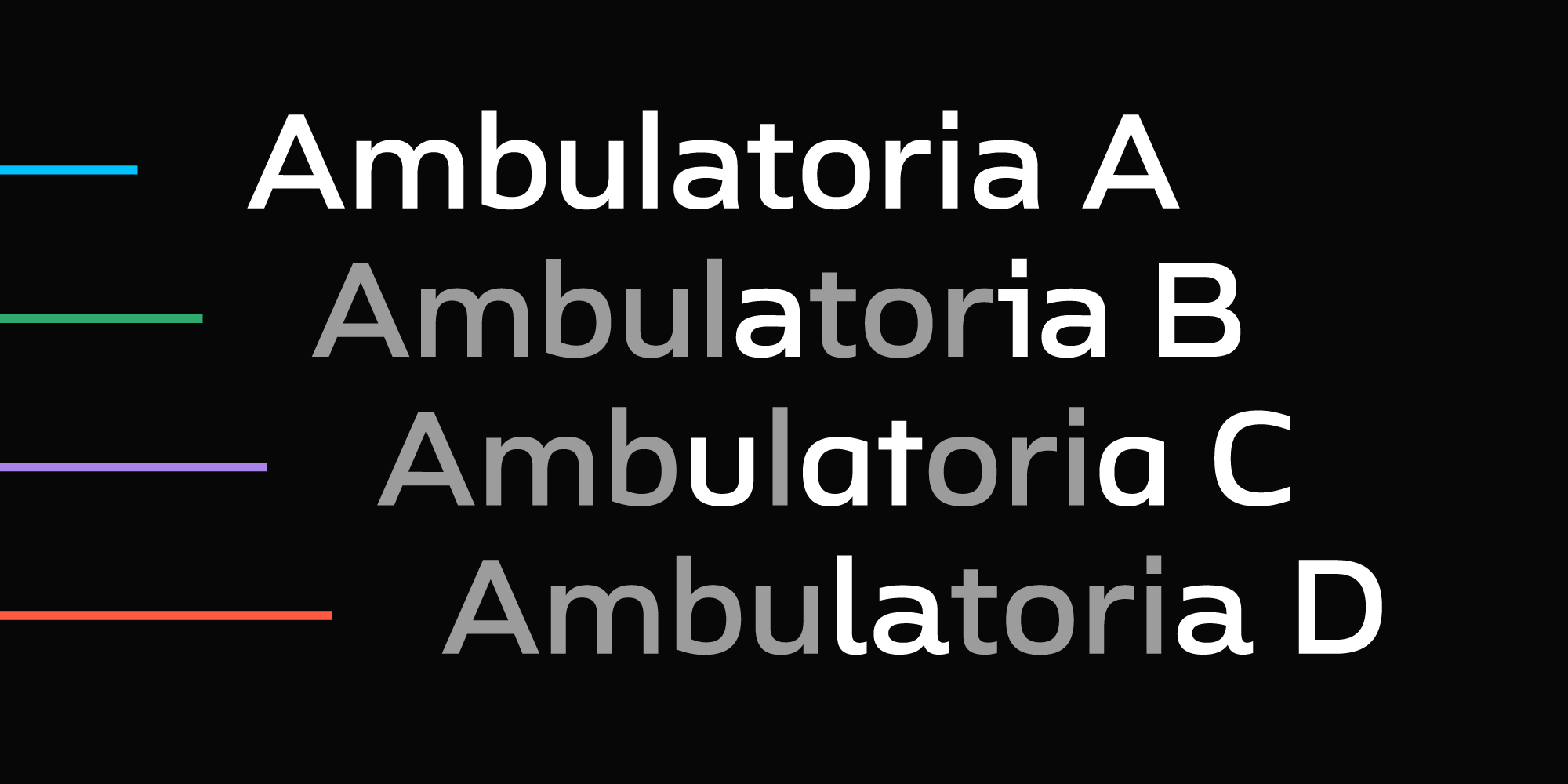 Ambulatoria is a sturdy open aperture sans-serif that comes in four variations. Each variation, A, B, C, and D, contains alternative variants for certain glyphs that allow the designer to change character and texture of the text.