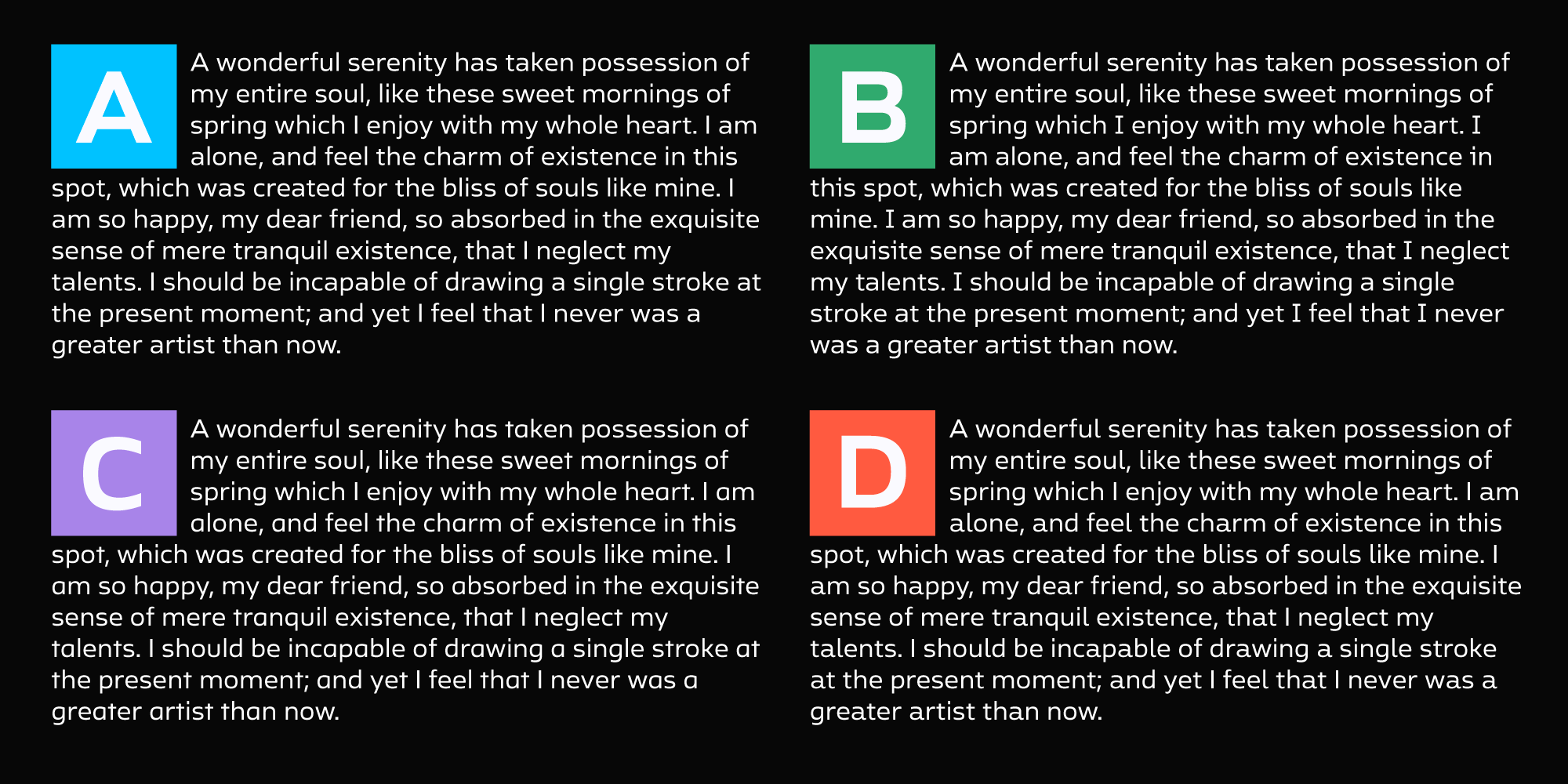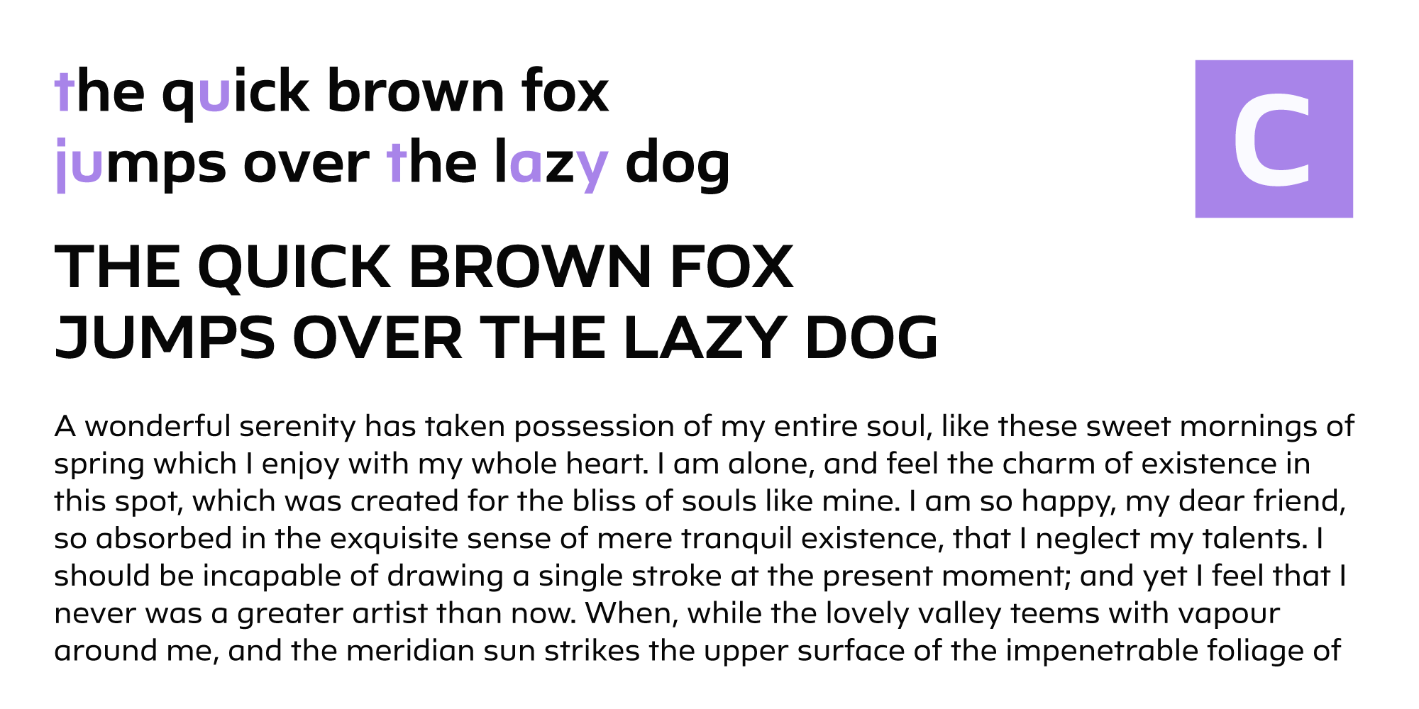 Ambulatoria is a sturdy open aperture sans-serif that comes in four variations. Each variation, A, B, C, and D, contains alternative variants for certain glyphs that allow the designer to change character and texture of the text.