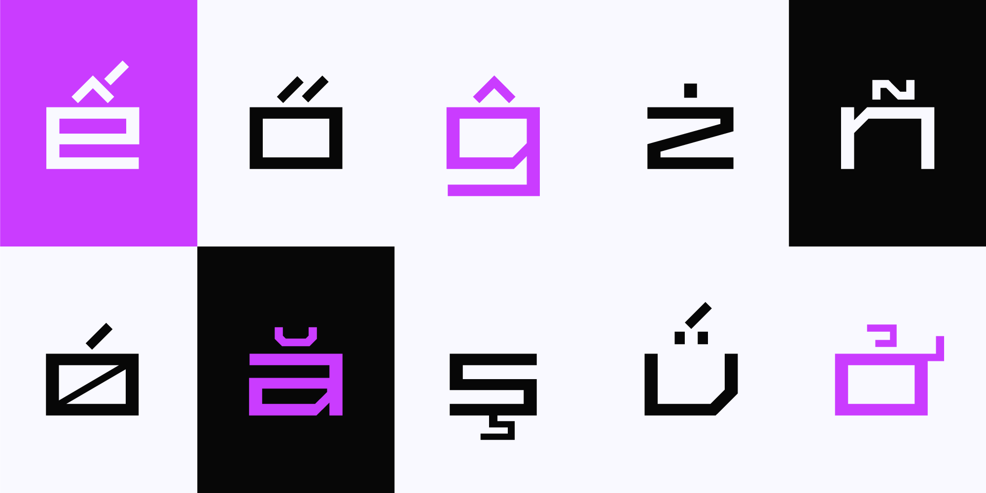 Exabyte is a modular display sans-serif prevailed by 90º angles. Its 63 plain styles consist of 7 widths and 9 weights. Each heaviest weight also comes in Outline and Engrave styles (non-layerable) in all 7 widths, bringing the overall style count to 77.