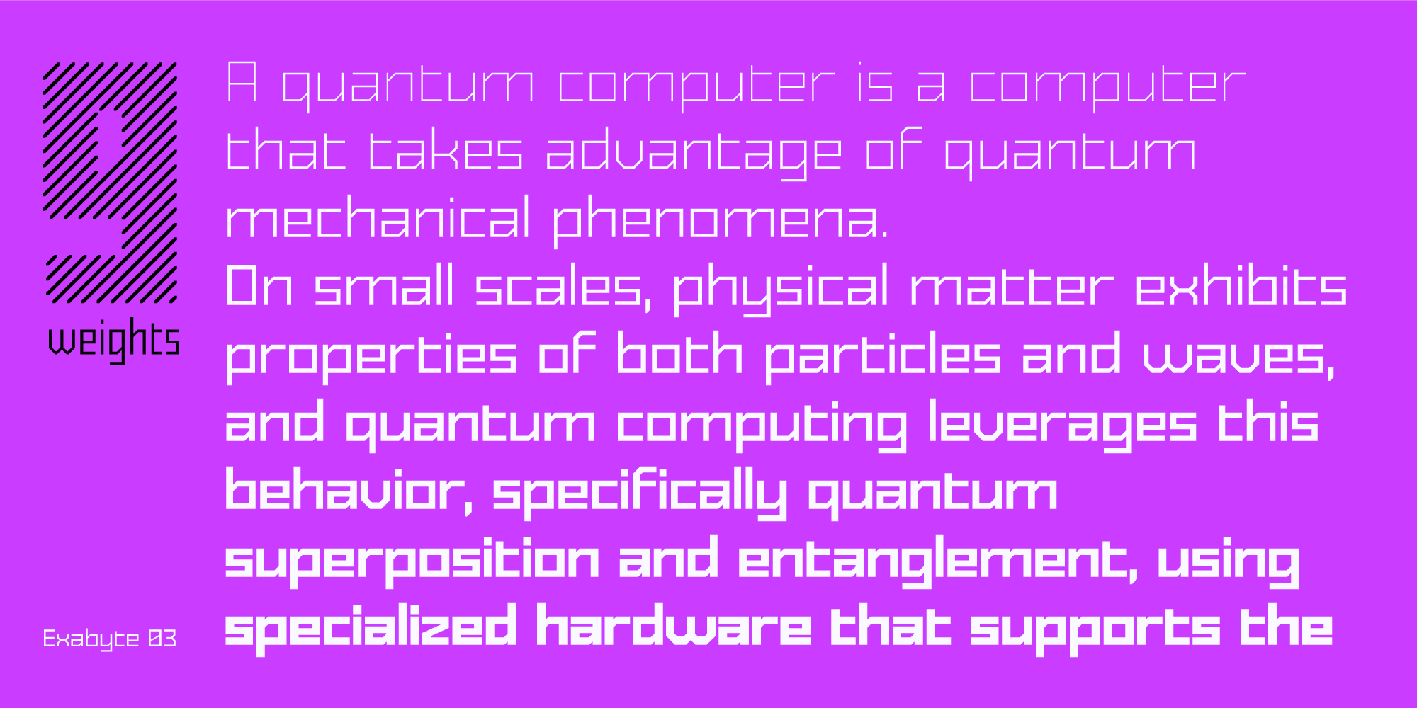 Exabyte is a modular display sans-serif prevailed by 90º angles. Its 63 plain styles consist of 7 widths and 9 weights. Each heaviest weight also comes in Outline and Engrave styles (non-layerable) in all 7 widths, bringing the overall style count to 77.