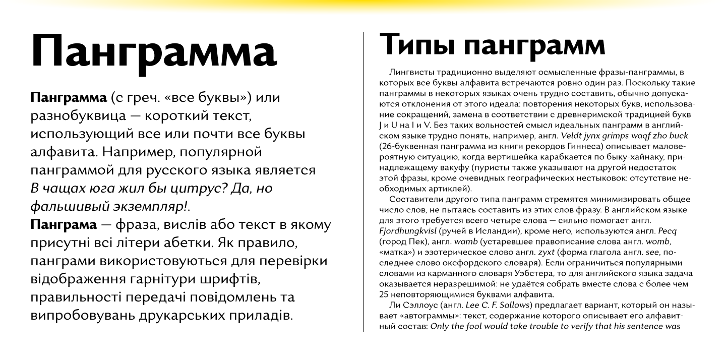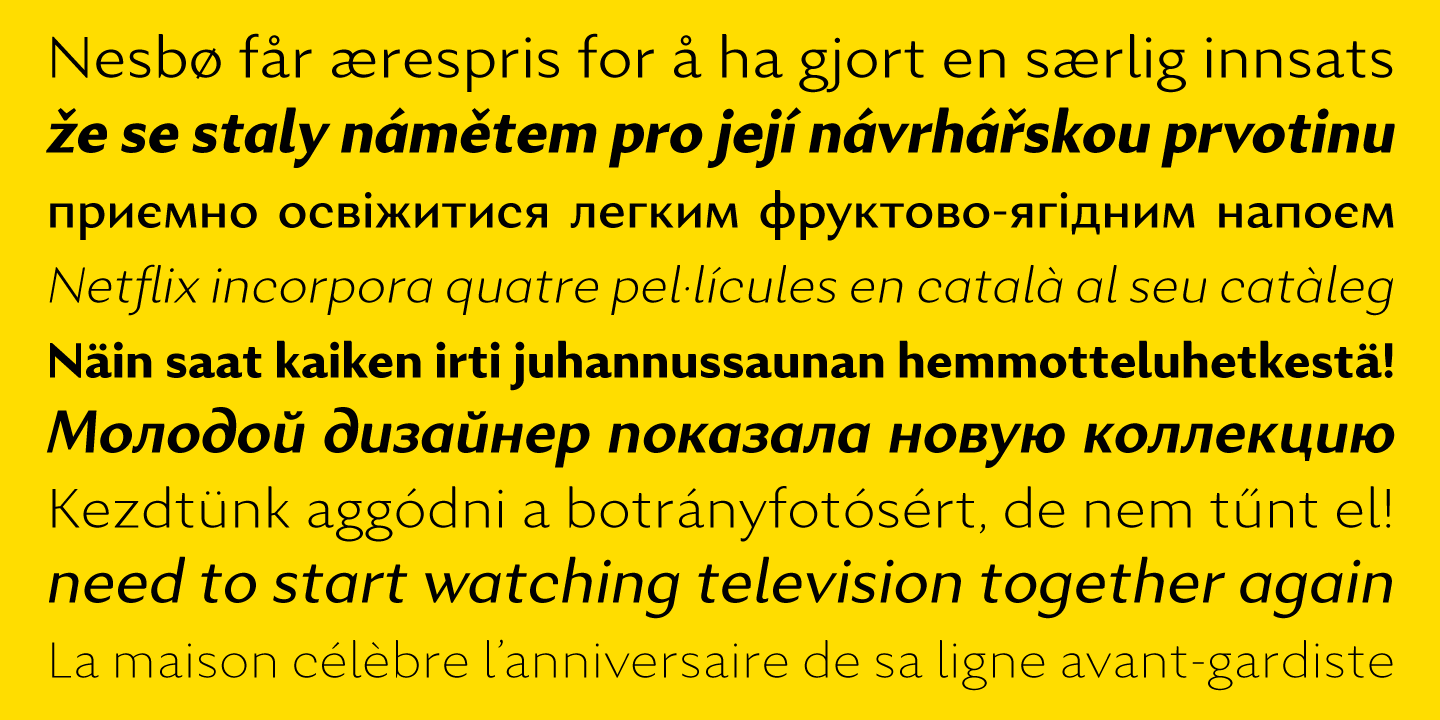 The typeface comes in 8 weights + real italics, each supporting numerous Latin-based and major Cyrillic languages. Its OpenType features include ligatures, small caps, 6 sets of digits, superiors and inferiors, fractions, ordinals, respective punctuation varieties including all-cap punctuation, as well as language-specific alternates. It also features the newly adopted German capital Eszett.