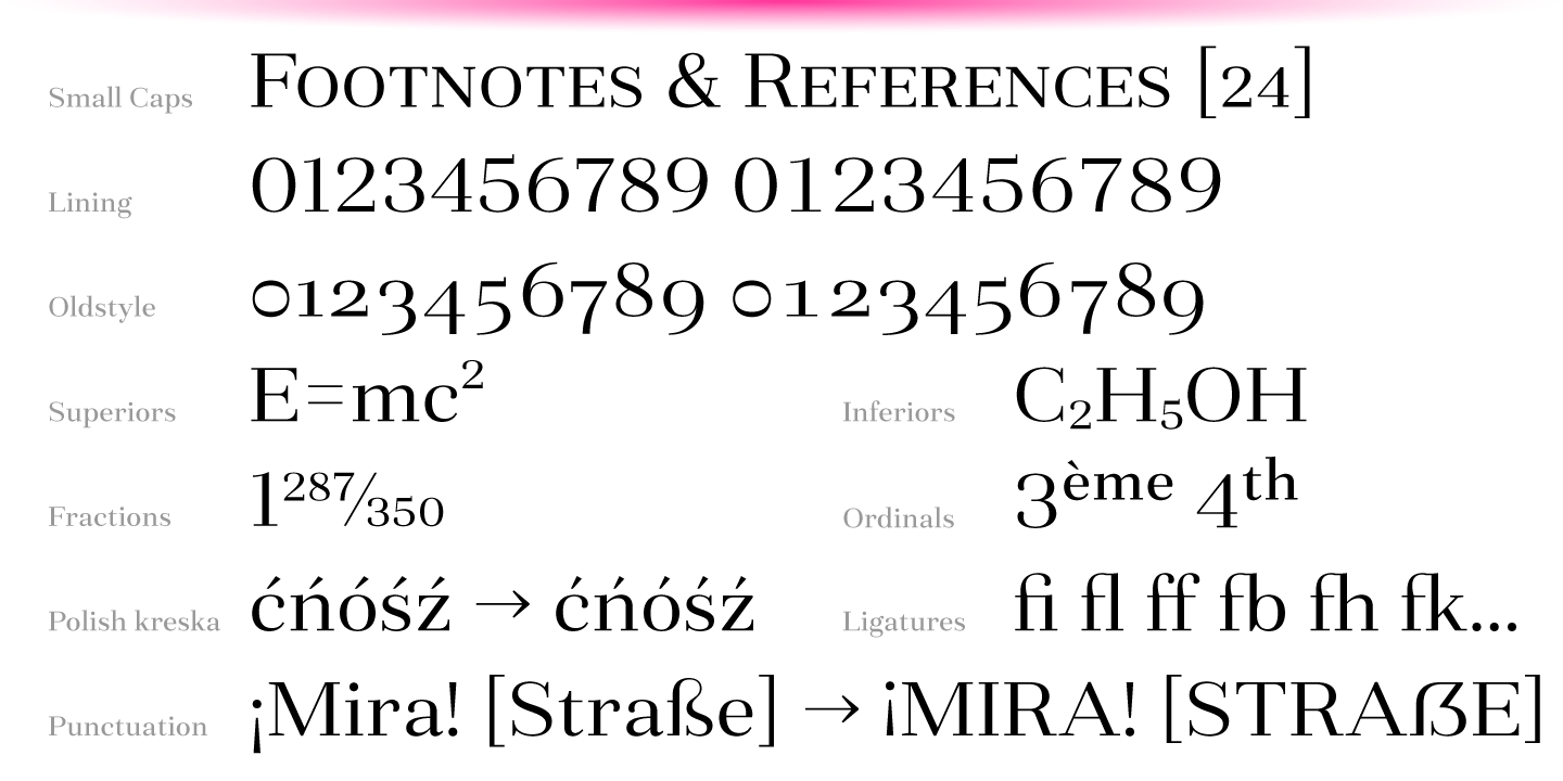 The glyph set supports all European Latin-based languages, as well as all major languages that use Cyrillic script. The type family also suppors numerous OpenType features, including 6 sets of digits, small caps, fractions, superscript and subscripts, ordinals etc.