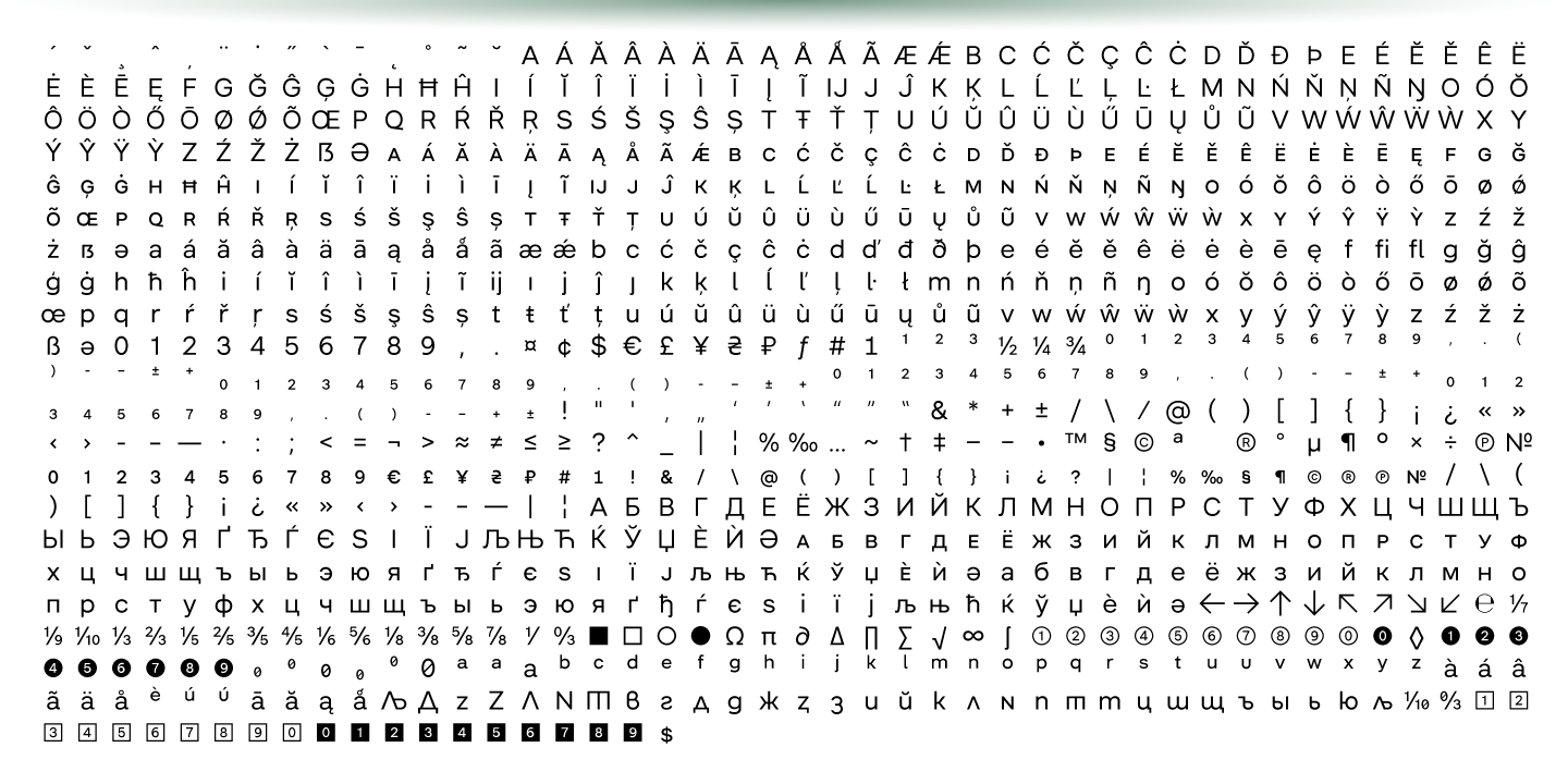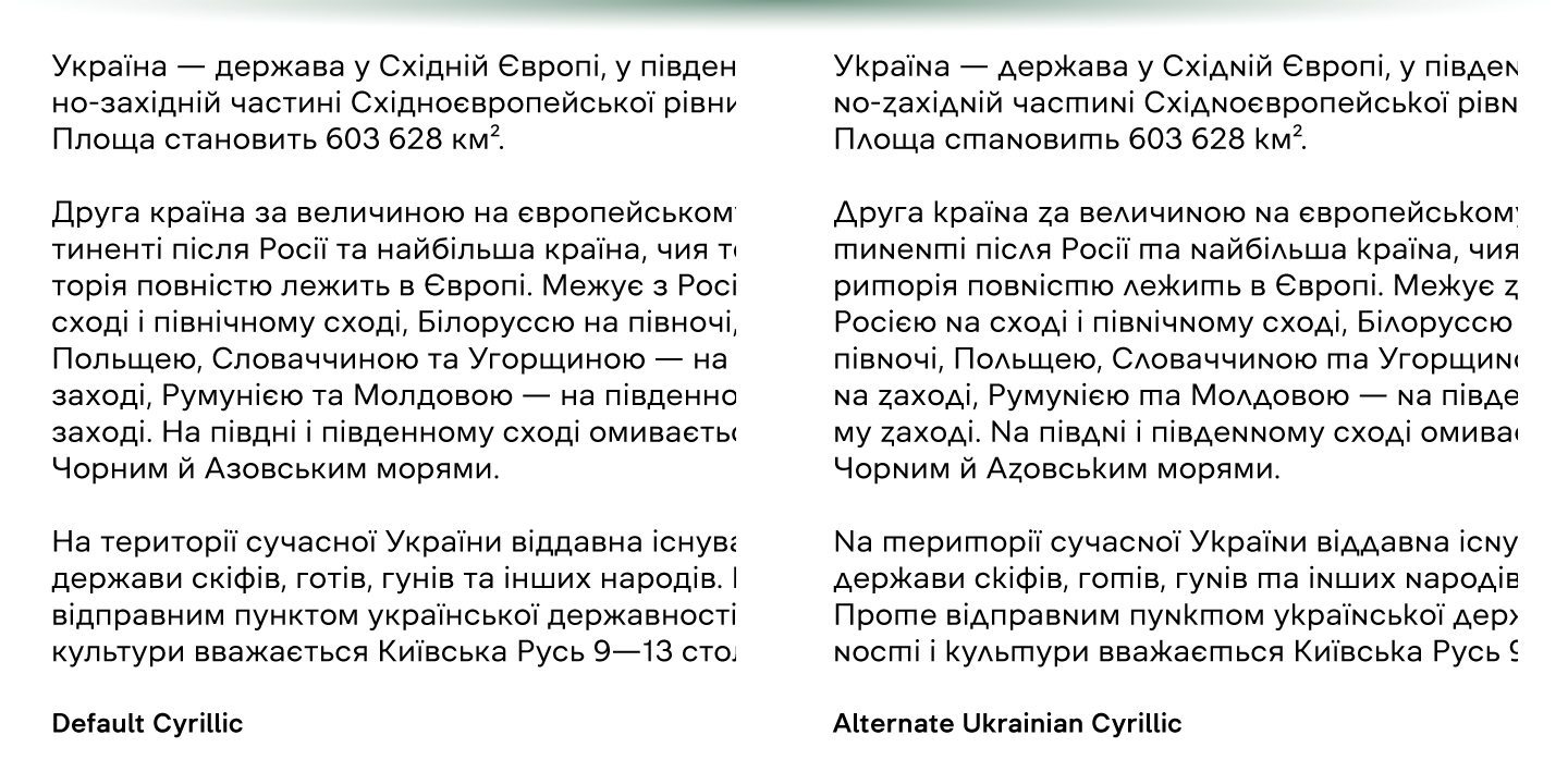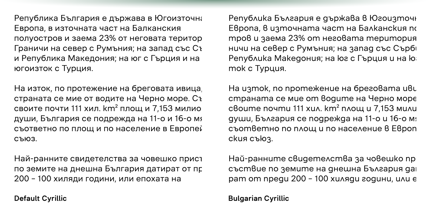 The typeface can be customised with several sets of alternate glyphs and OpenType features. The Cyrillic part contains alternates for Bulgarian as well as alternative Ukrainian forms.