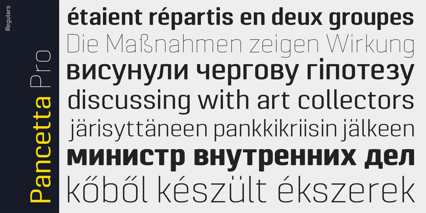 Pancetta Pro is a squarish sans-serif typeface with semi-closed aperture and pillow-shaped terminals.