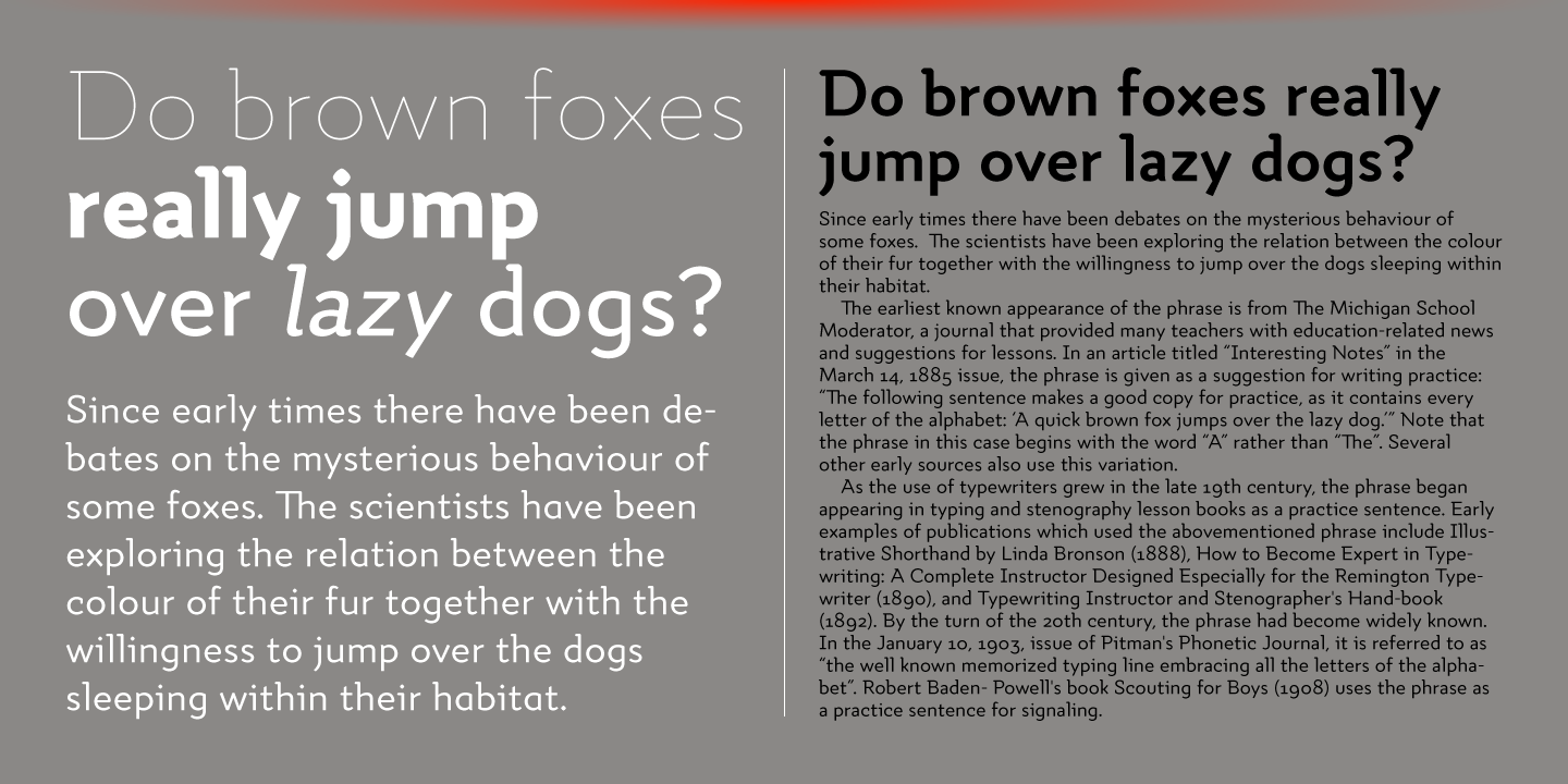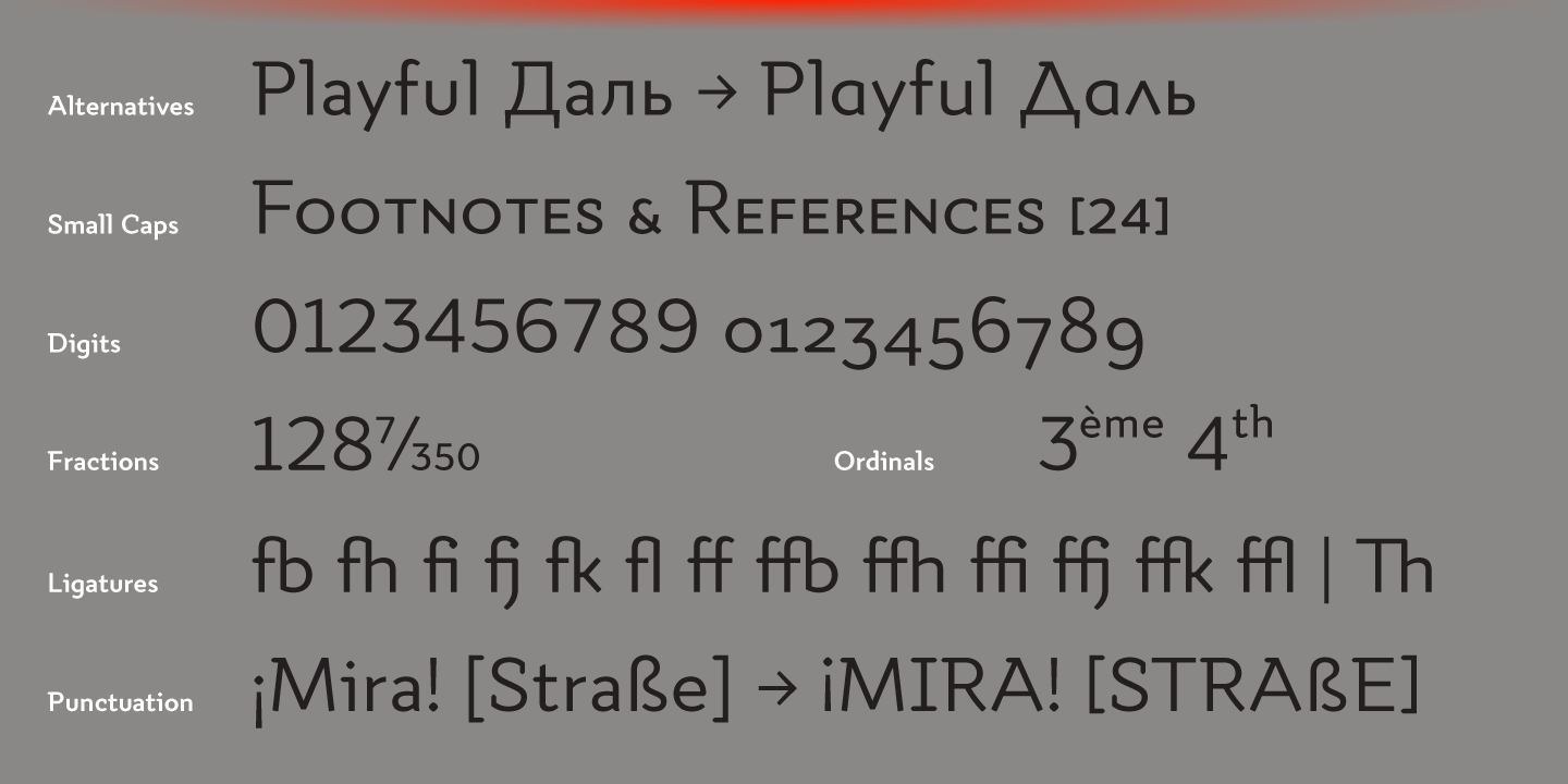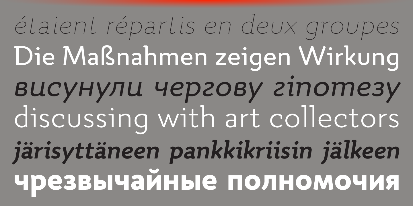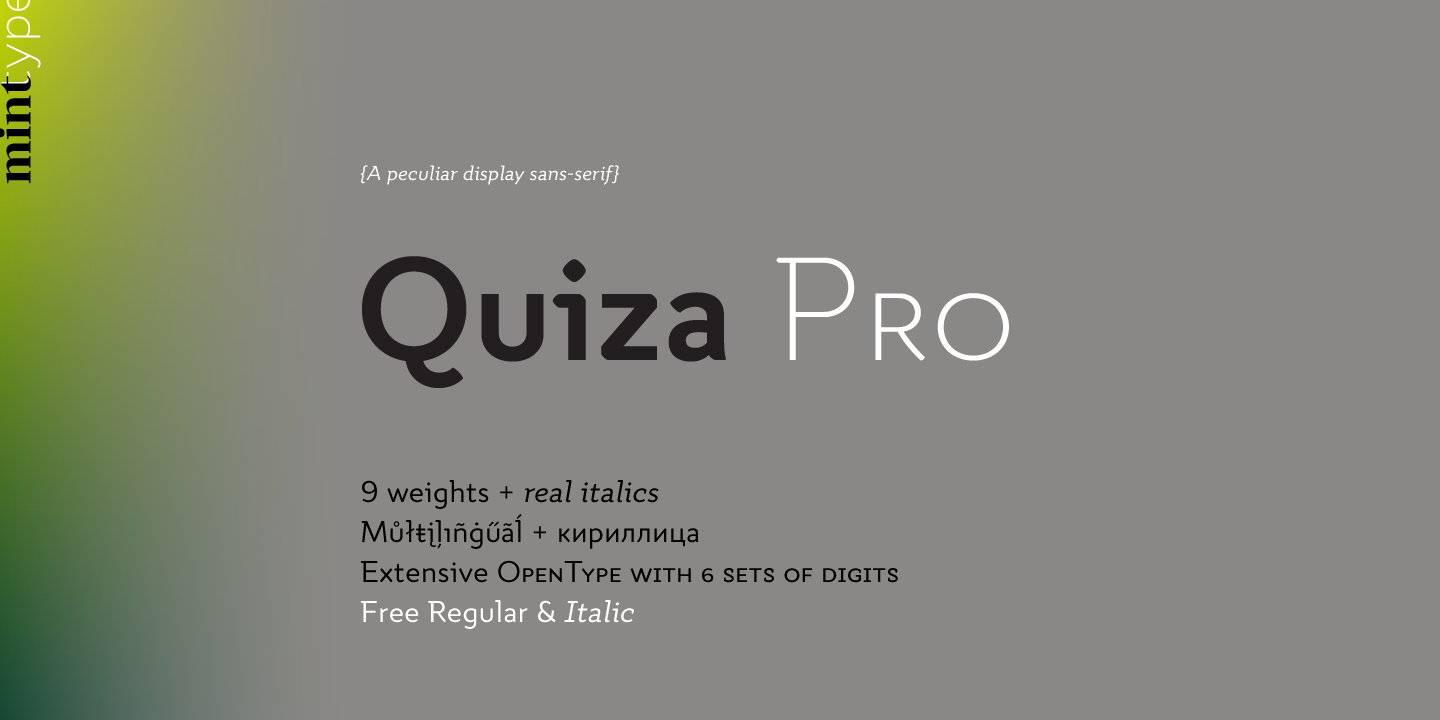 Quiza Pro comes in 8 weights + matching italics each supporting numerous Latin-based languages as well as major Cyrillic languages. It is packed with OpenType features like ligatures, small caps, 6 sets of digits, 3 stylistic sets, superiors and inferiors, fractions, ordinals, respective punctuation varieties including all-cap punctuation, as well as language-specific alternates.