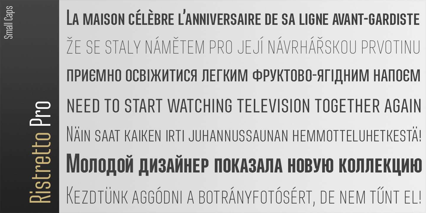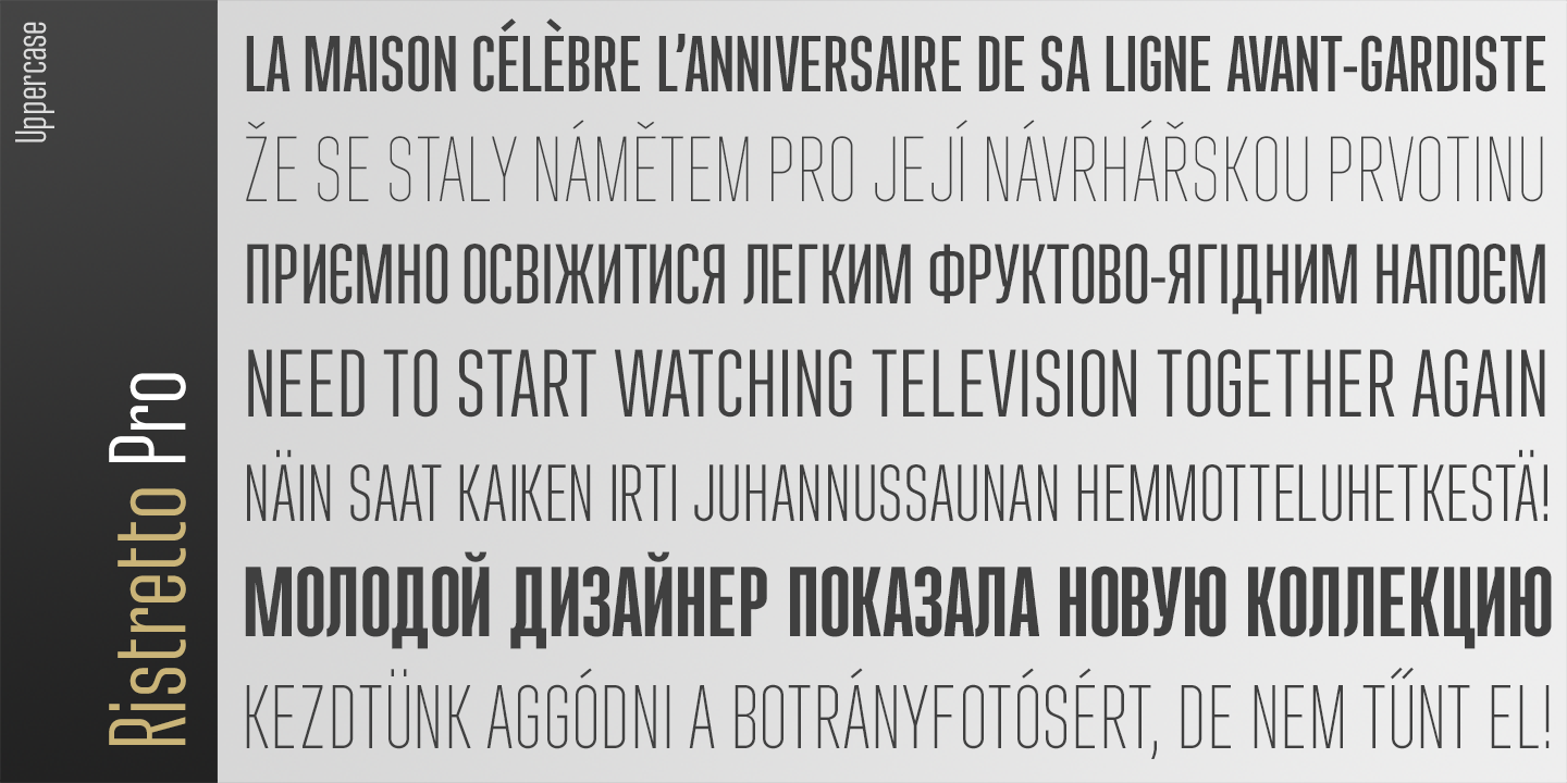 Ristretto Pro is an extremely narrow display sans-serif font family available in 8 weights. It features rich language support, 6 sets of figures and small caps.