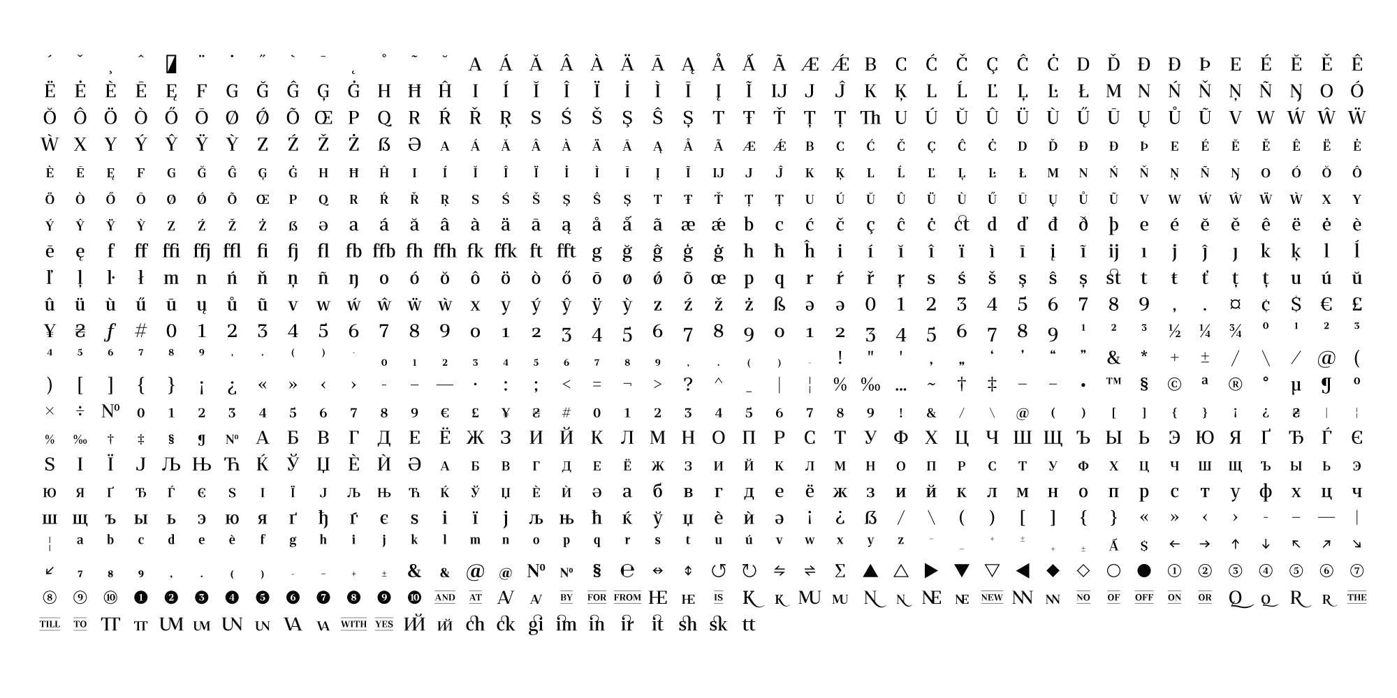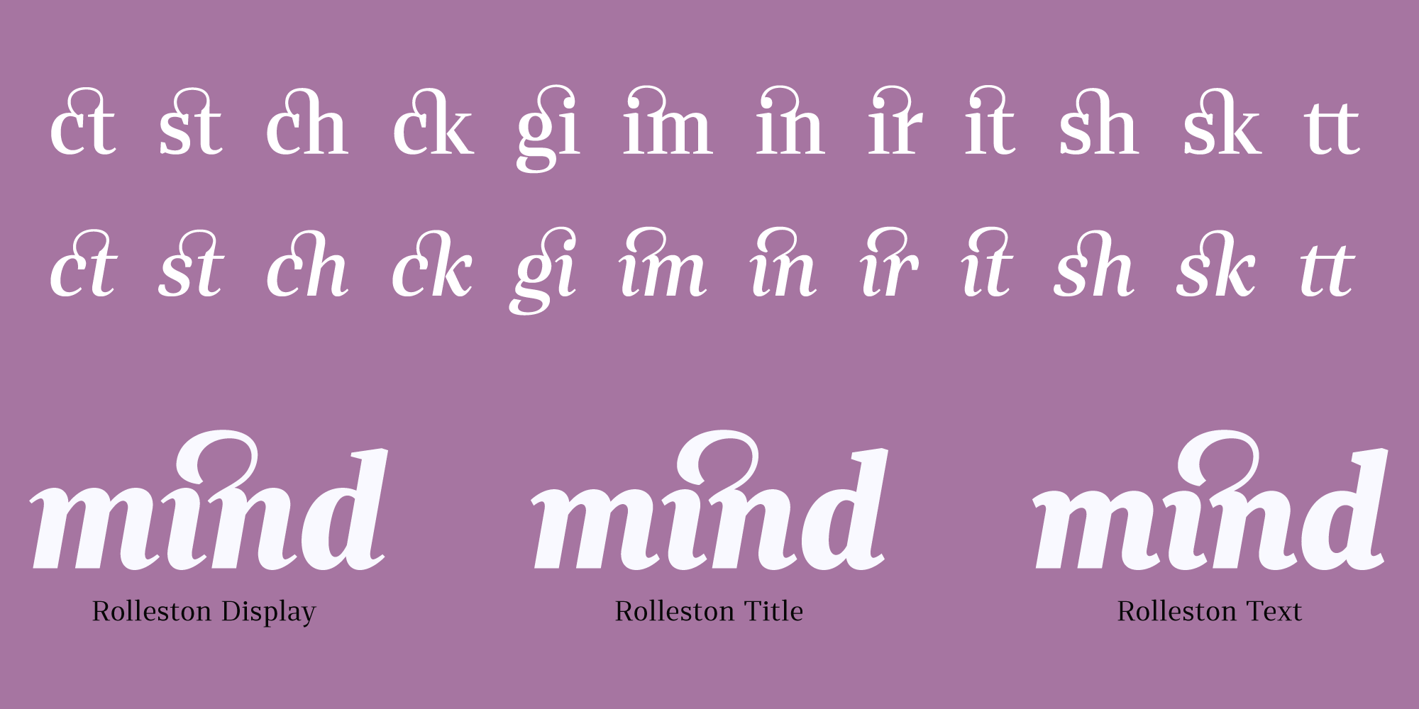 Rolleston features extensive language support including Cyrillic, contains a variety of Opentype features, and an abundance of ligatures and alternative to choose from – for fancy headlines and elegant body copy.