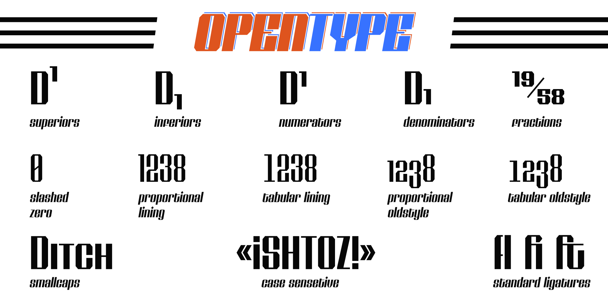 Shtozer is a retro-themed display typeface based on designs of 1960s and 1970s with additional inspiration taken from Cyrillic ornate lettering Vyaz.