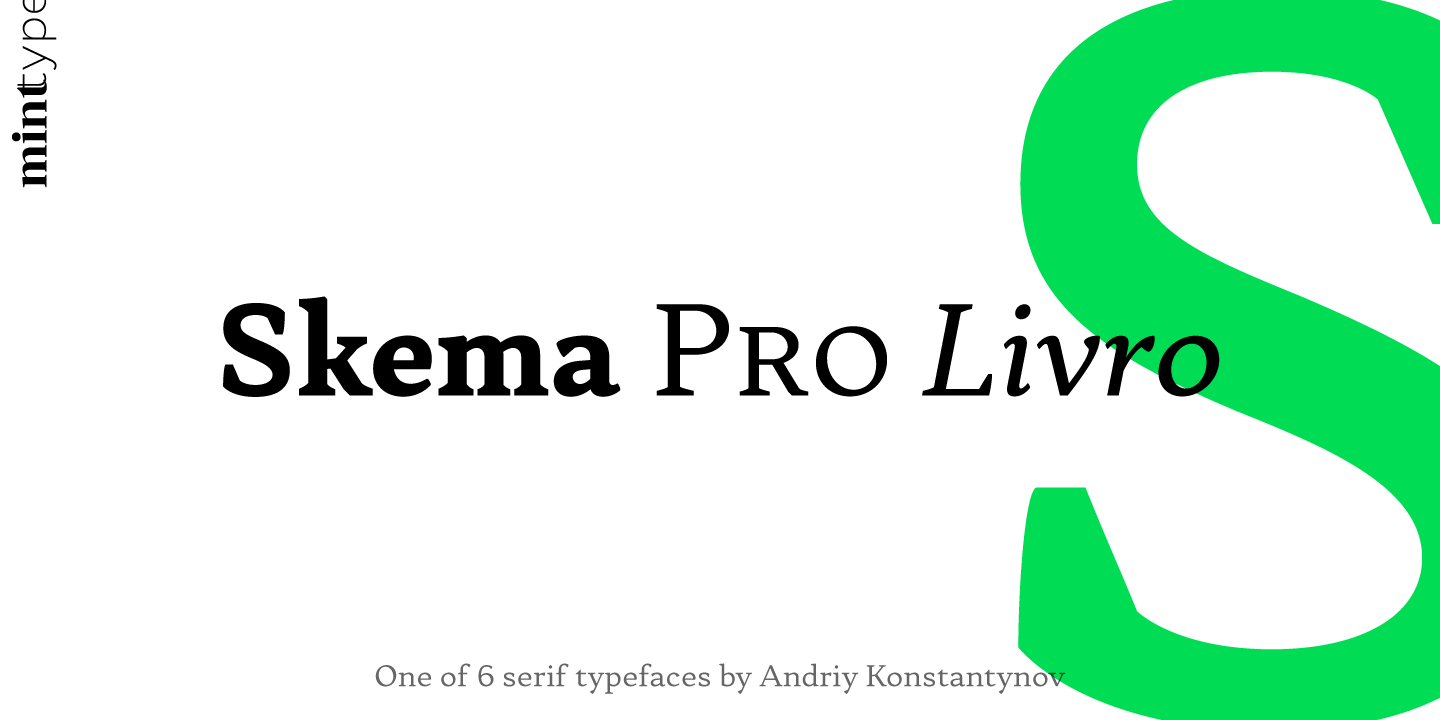 Skema Pro Livro is a low contrast, low x-height typeface with inclined axis. It is designed to work in books, where long ascenders and descenders along with increased line-spacing aid comfortable reading.