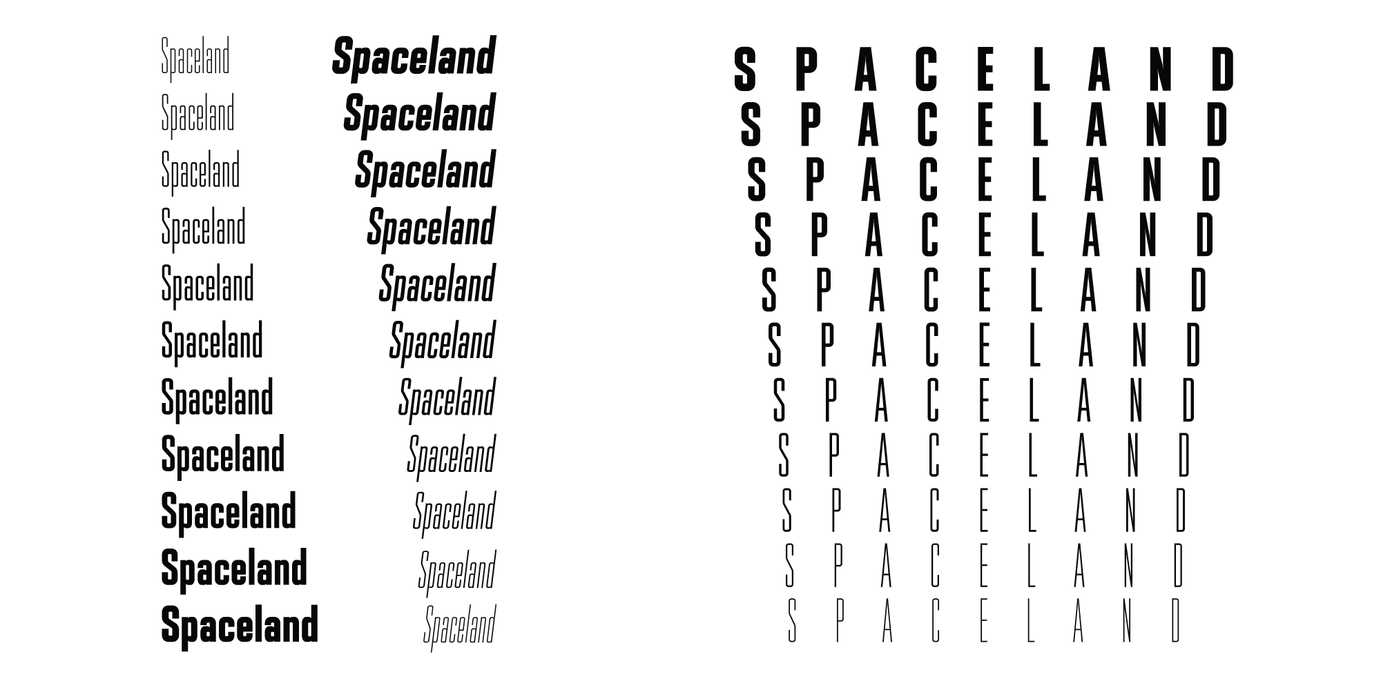 Spaceland is a narrow display font family with constant counter width and gradually growing stroke over 11 weights with matching obliques.