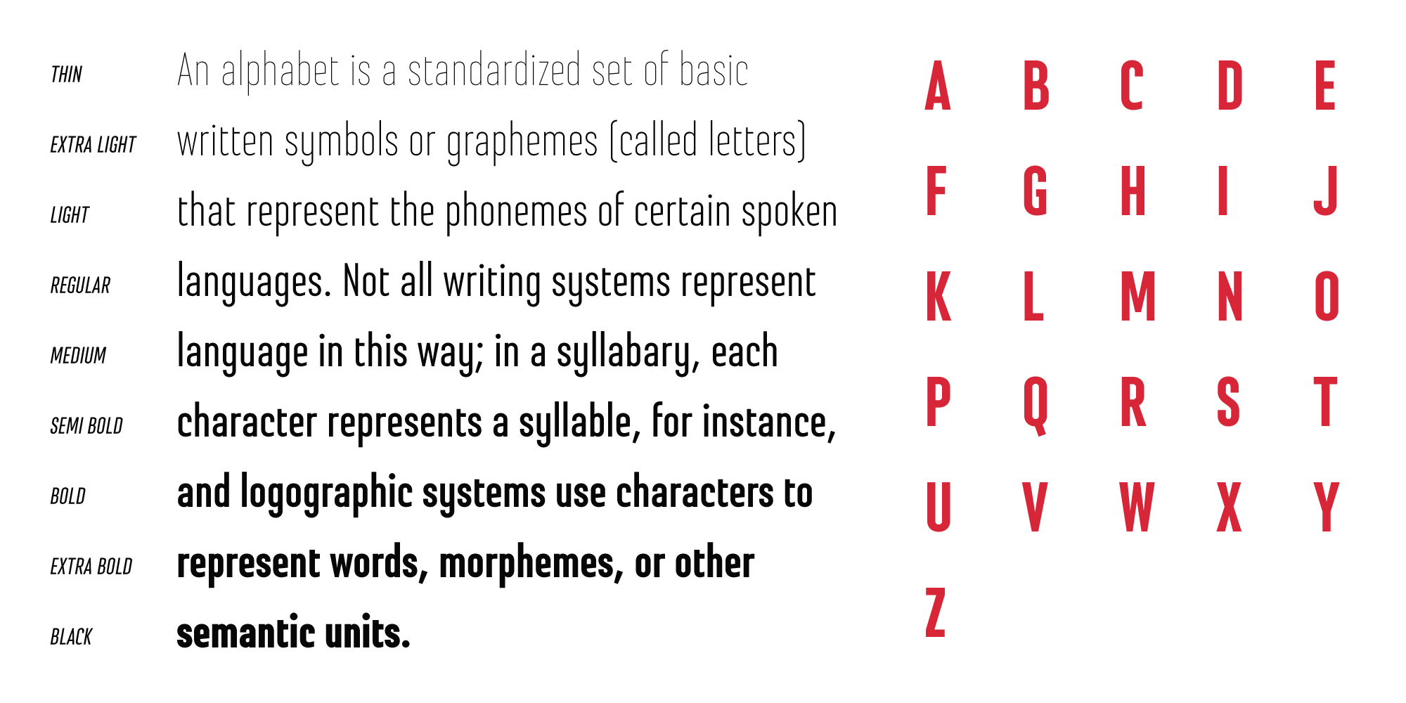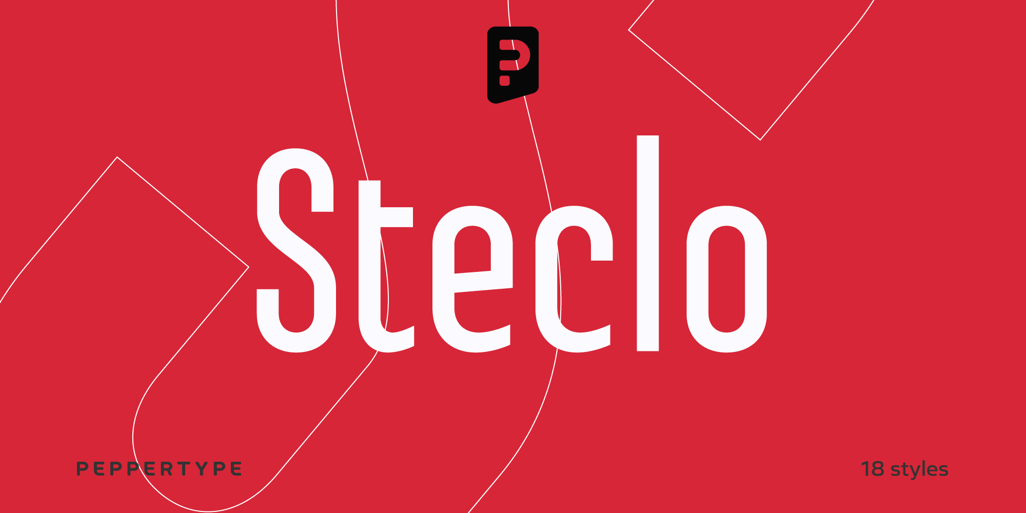 Steclo is a semi-closed narrowed display sans-serif typeface with pronounced technical character. It comes in 9 weights from Thin to Black accompanied by corresponding oblique italics. Steclo features rich language support including pan-European Latin and basic Cyrillic glyph sets.